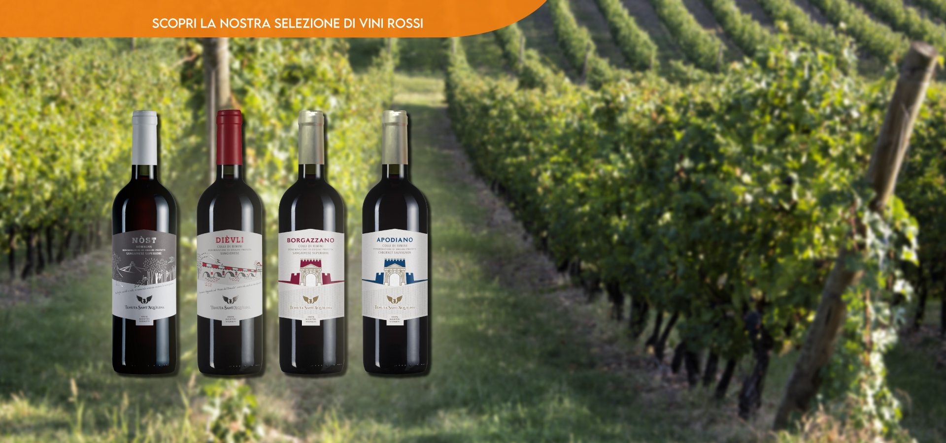Quando si parla di vino, abbiamo scelto gli autentici vini tipici riminesi della Tenuta Sant'Aquilina e i vini biologici senza solfiti aggiunti di Terre di Fiume. Si tratta di vini ottenuti con grande attenzione per la qualità della materia prima, con la raccolta a mano dei grappoli d'uva, la loro attenta selezione e vinificazione e, naturalmente, la loro storica appartenenza al nostro territorio.